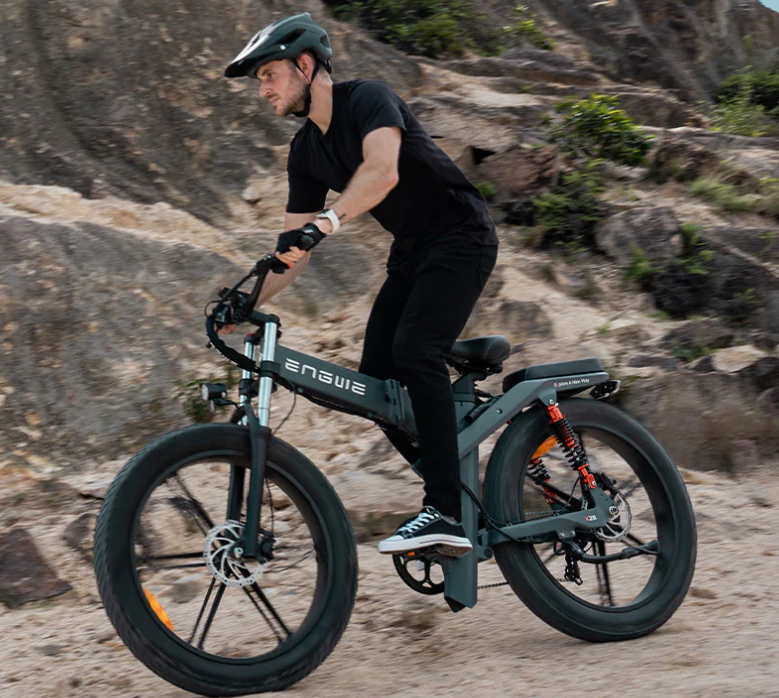 ENGWE X26 este o bicicletă electrică puternică, cu motor de 1200 W peak, autonomie de până la 150 km, suspensie triplă, frâne hidraulice și anvelope fat 26×4.0″ – ideală pentru teren dificil și drumuri urbane.