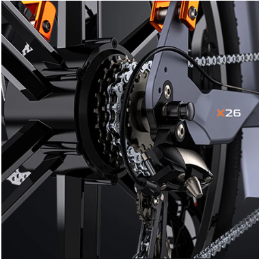 Inima modelului ENGWE X26 este motorul brushless de 1000 W, cu putere maximă de 1200 W, care oferă cuplu de aproximativ 70 N·m. Această putere permite porniri rapide și accelerație lină chiar și în teren deluros. Viteza maximă este de până la 50 km/h (în modurile ne-EU). Bateria 48 V / 19,2 Ah (sau opțional 29,2 Ah) oferă o autonomie de până la 150 km în modul PAS — un parametru excepțional în această categorie. Încărcarea durează aproximativ 8 ore, iar bateria este detașabilă pentru încărcare comodă acasă sau la birou. Biciclistul poate alege dintre mai multe niveluri de asistență, adaptând performanța la nevoi — de la mod economic până la mod sport cu putere maximă. Anvelopele 26×4.0″ și suspensia triplă asigură transfer excelent al puterii, stabilitate și confort. ENGWE X26 oferă astfel echilibrul perfect între putere, autonomie și confort, fiind unul dintre cele mai bune e-bike-uri din clasa sa.