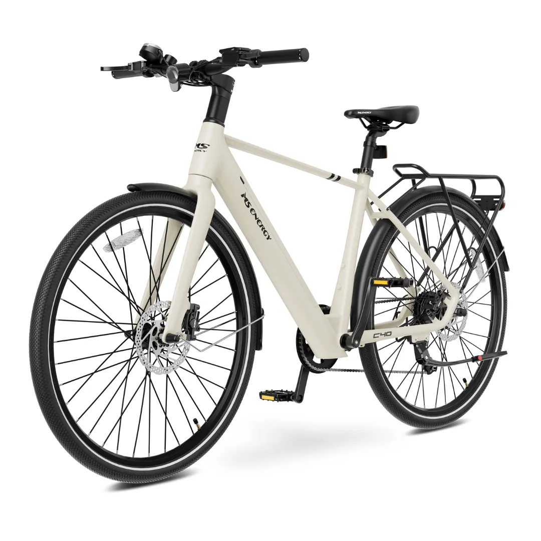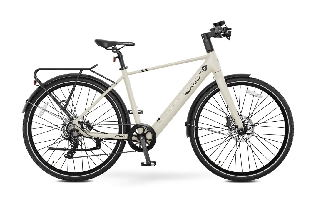 Bicicletă electrică urbană modernă MS ENERGY C40 (2025) cu motor de 250 W, autonomie de până la 60 km, frâne hidraulice, cadru ușor din aluminiu de 21 kg și baterie integrată 36 V/10 Ah pentru o deplasare confortabilă și sigură.
