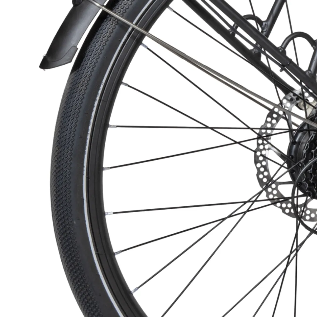 Designul MS ENERGY C40 combină estetica minimalistă cu detalii practice care cresc confortul și durabilitatea bicicletei. Cadrul este realizat din aliaj de aluminiu 6061, prelucrat cu tehnologia SMT pentru îmbinări netede, fără suduri vizibile. Cablurile interne nu doar îmbunătățesc aspectul, ci și protejează componentele electrice de deteriorări. Roțile de 28 inch cu anvelope rezistente 700 × 45 C sunt proiectate pentru suprafețele urbane și oferă stabilitate bună chiar și la viteze mai mari. Schimbarea vitezelor este asigurată de sistemul fiabil Shimano ALTUS RD-M310-L cu 8 viteze, controlat prin manetele Shimano SL-M315-8R, permițând schimbări fluide în funcție de teren și trafic. Pentru frânare sigură sunt disponibile frâne hidraulice pe disc față și spate, care oferă performanțe constante în orice condiții meteo. Display-ul LCD modern afișează viteza, starea bateriei, distanța parcursă și modul de asistență curent. Iluminarea constă într-un far LED frontal și lumina spate integrată, asigurând siguranță chiar și în condiții de luminozitate redusă.