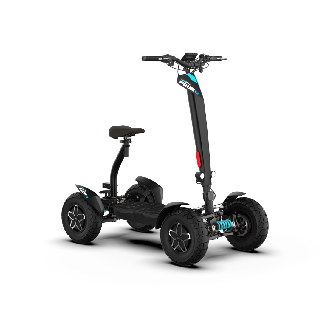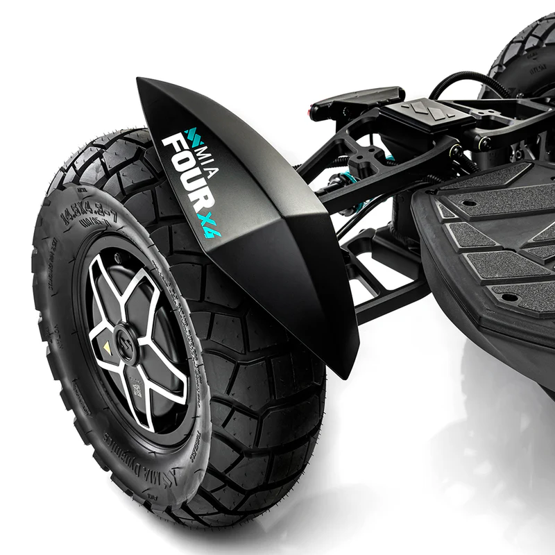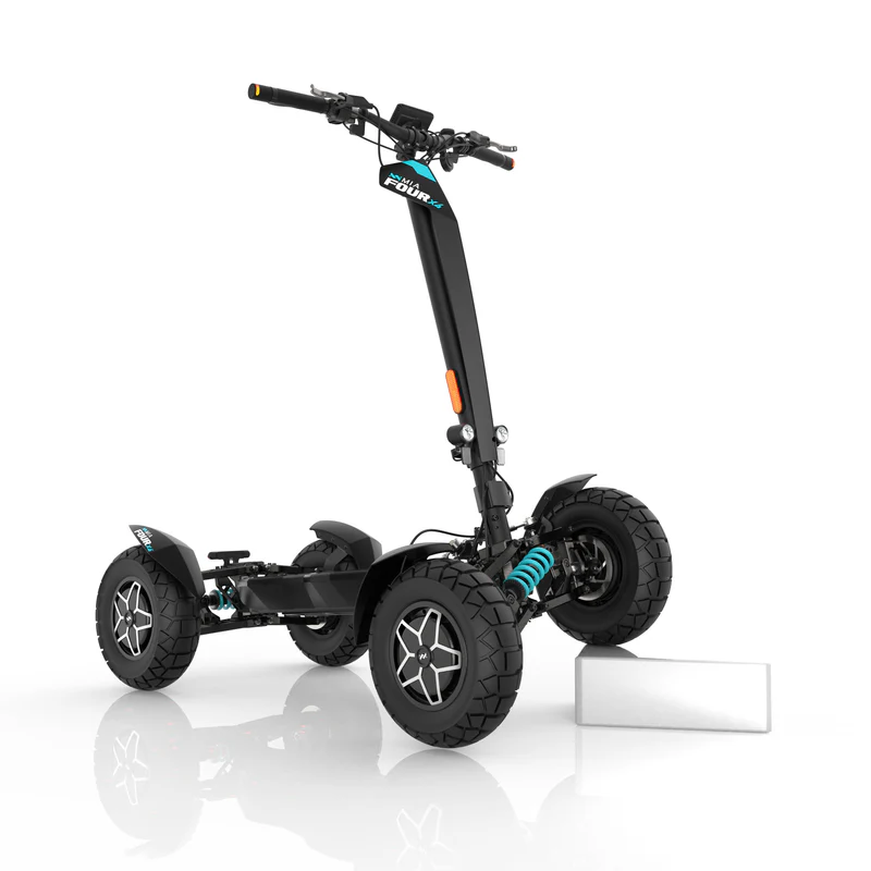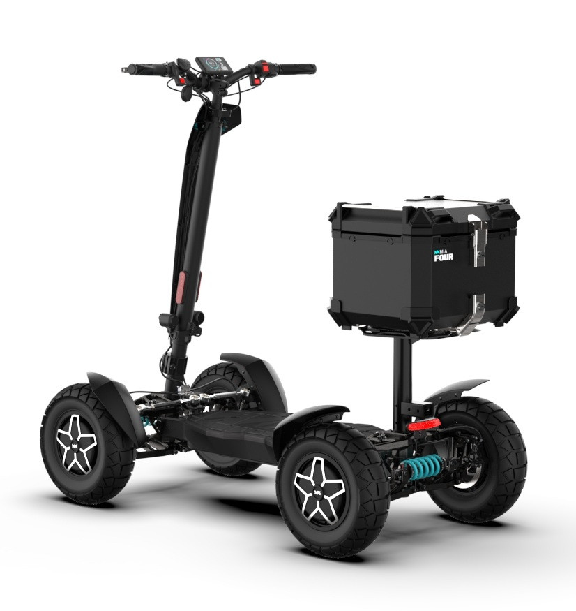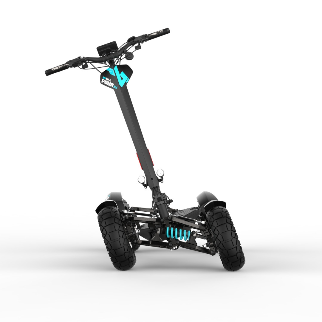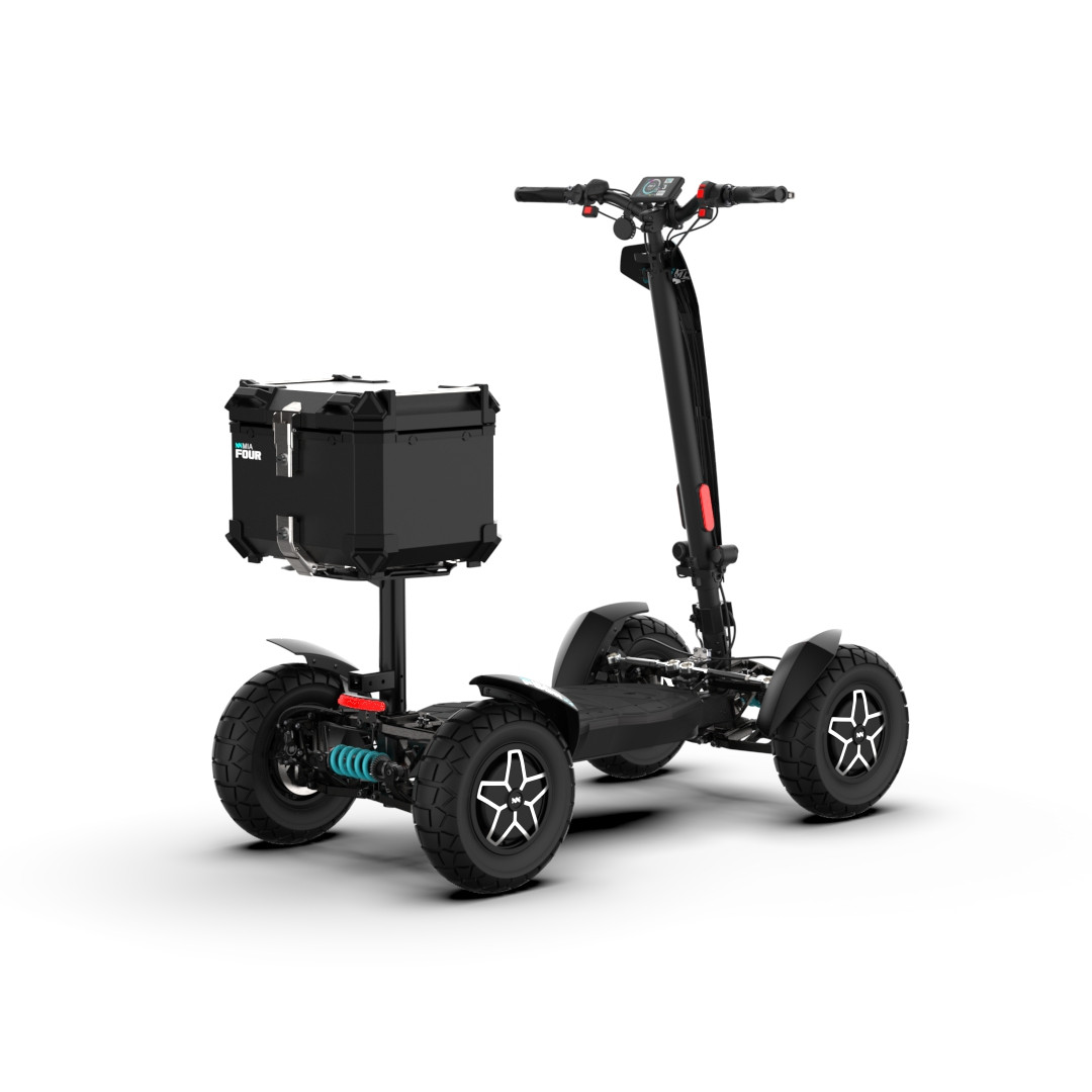 MIA Four X4 (4×4) – trotinetă electrică revoluționară cu tracțiune integrală, putere de 7200 W, autonomie de până la 120 km și o baterie robustă de 60 V / 35 Ah. Fiabilă, puternică și pregătită pentru orice teren.