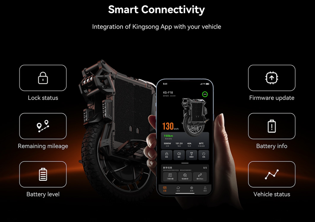 KingSong F18 este un monociclu electric de înaltă performanță, cu motor de 5000 W (9000 W putere de vârf), viteză de până la 120 km/h, baterie de 2664 Wh, autonomie de 150 km și suspensie în 4 puncte cu cursă de 100 mm. Este un model de top destinat utilizatorilor exigenți.