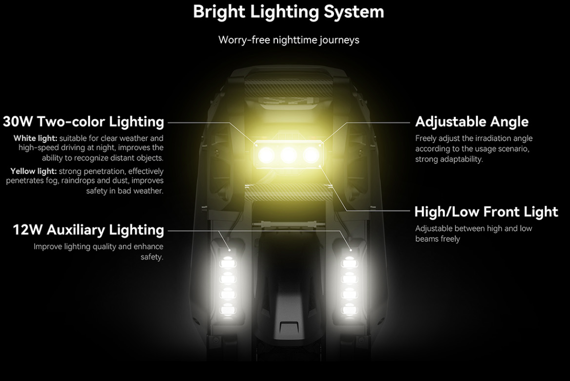 La viteze de până la 120 km/h, siguranța trebuie să fie pe primul loc – iar KingSong F18 respectă acest principiu până la cel mai mic detaliu. Motorul puternic (5000 W / 9000 W peak) este controlat de o electronică avansată care monitorizează constant stabilitatea, tracțiunea și performanța. Iluminarea de 4 × 5 W asigură vizibilitate ridicată și lumină puternică, iar unghiul reglabil al farurilor oferă o mai bună vizibilitate a suprafeței drumului chiar și la viteze mari. Anvelopele late 2.75-14 ajută la menținerea stabilității la viteze ridicate și în viraje strânse, în timp ce suspensia cu cursă de 100 mm absoarbe eficient șocurile, permițând riderului să păstreze controlul chiar și pe suprafețe denivelate. Construcția din aliaj de magneziu sporește rezistența și durabilitatea întregului corp, iar capacitatea de încărcare de 140 kg permite utilizarea sigură chiar și cu sarcini mai mari. Datorită capacității de urcare de până la 45°, F18 face față fără probleme și rampelor foarte abrupte, fără solicitarea inutilă a motorului. Toate aceste elemente contribuie la o experiență de rulare stabilă și sigură, esențială la niveluri ridicate de putere și viteză.