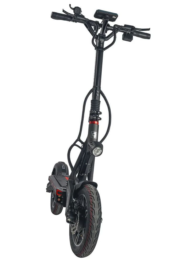 Trotineta dispune de două motoare puternice cu o putere nominală de 2 × 1 200 W și o putere maximă de vârf de până la 4 000 W, oferind o accelerație imediată și o experiență dinamică de condus. Viteza maximă atinge până la 70 km/h (versiune deblocată), în timp ce limitarea la 25 km/h respectă toate reglementările UE. Energia este furnizată de o baterie de 60 V 25 Ah (sau 60V 20 Ah) echipată cu celule LG (sau CN) de calitate, garantând durată lungă de viață și fiabilitate. Autonomia la o singură încărcare este de până la 90 km, suficient pentru naveta zilnică sau excursii mai lungi de weekend. Cu încărcătorul rapid (5A), bateria se încarcă în aproximativ 5 ore, o îmbunătățire semnificativă față de modelele obișnuite. Stabilitatea la condus este susținută și de construcția spațioasă – ampatamentul de 1 140 mm și garda la sol de 190 mm asigură confort și control chiar și la viteze mari. Acest model reprezintă un compromis ideal între performanță, autonomie și practicitate.