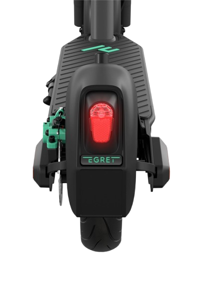 Siguranța la rulare este unul dintre pilonii principali pe care Egret Ey! 6 își construiește identitatea. Baza o reprezintă sistemul de frânare combinat, care include o frână cu tambur pe față, o frână pe disc pe spate și o frână electronică recuperativă. Această combinație garantează o distanță de frânare semnificativ mai scurtă și un control ridicat chiar și în situații mai dificile. Astfel, utilizatorul are certitudinea că trotineta reacționează rapid și intuitiv, fără întârziere sau pierdere de stabilitate. Prezența recuperării protejează în același timp frâna mecanică spate și îi prelungește durata de viață. Vizibilitatea este un alt factor esențial de siguranță. Egret Ey! 6 dispune de un far LED frontal de 700 lumeni, care luminează drumul chiar și în întuneric total, și de o lumină LED spate puternică, cu indicator de frânare. Un avantaj real îl reprezintă însă semnalizatoarele integrate amplasate pe ghidon – poziția lor este în mod natural în câmpul vizual al celorlalți participanți la trafic, ceea ce crește considerabil siguranța la viraje. Construcția trotinetei este solidă și stabilă, iar în combinație cu anvelopele tubeless de 10" asigură o tracțiune excelentă. Rezistența la apă – IPX5 pentru corp și IP67 pentru baterie – garantează o funcționare sigură chiar și pe ploaie. Cu o capacitate de încărcare de până la 120 kg, trotineta rămâne stabilă și ușor de controlat chiar și la sarcini mai mari. Egret Ey! 6 este, pe scurt, un model care pune siguranța utilizatorului pe primul loc.