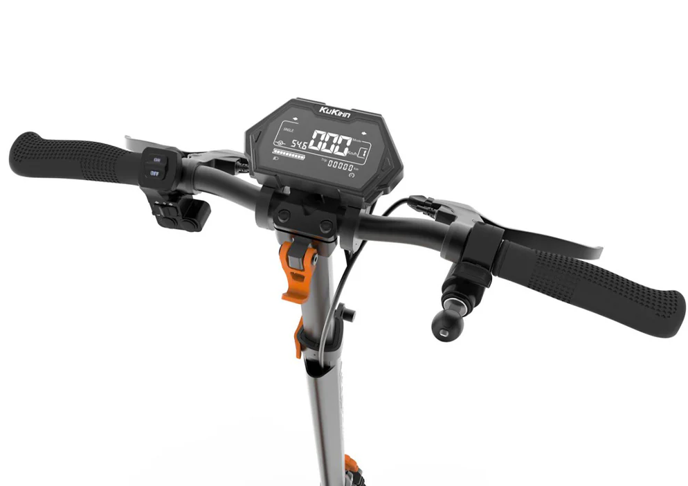 KuKirin G2 Max impresionează din prima clipă prin designul său sportiv și modern, care combină construcția robustă cu linii elegante. Datorită cadrului de înaltă calitate, trotineta nu este doar estetic atractivă, ci și extrem de rezistentă la uzura zilnică. Dimensiunile desfășurate sunt 1260 × 605 × 1300 mm, iar pliat 1260 × 605 × 580 mm, facilitând depozitarea și transportul. Greutatea de aproximativ 31 kg oferă stabilitate și rezistență, rămânând totuși ușor de manevrat. Confortul la condus este asigurat de un sistem de suspensie cu patru brațe combinat cu roți off-road de 10 inci, rezistente la uzură și șocuri. KuKirin G2 Max este echipat cu un scaun detașabil, oferind confort suplimentar pe distanțe lungi. Sistemul de iluminare în șase puncte include far puternic frontal, iluminare laterală, lumini spate și lumini de frână, asigurând vizibilitate maximă ziua și noaptea. Ecranul inteligent afișează viteza, nivelul bateriei și permite controlul facil al luminilor, semnalizatoarelor și claxonului.
