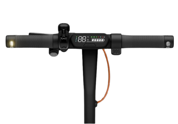 Designul trotinetei Ninebot KickScooter E2 Plus E II se bazează pe linii minimaliste, completate de o construcție robustă din oțel. Este utilizat materialul auto SPFH590, cunoscut pentru raportul excelent între rezistență și flexibilitate, ceea ce crește durabilitatea trotinetei în utilizarea zilnică. Un element practic este posibilitatea de pliere ușoară la dimensiuni compacte de 1081 × 475 × 548 mm, permițând transportul facil în mână, depozitarea în portbagajul mașinii sau sub birou. În stare desfăcută, trotineta are dimensiunile 1081 × 475 × 1177 mm, oferind suficient spațiu și stabilitate în timpul mersului. Pe ghidon se află un display LED de 2,8" clar și ușor de citit, care afișează instantaneu viteza, modul de rulare, nivelul bateriei și alte informații importante. Pentru un confort sporit, Ninebot E2 Plus E II este echipată cu o suspensie frontală cu arc, cu o cursă de aproximativ 27 mm, care absoarbe vibrațiile provenite de la denivelări și îmbunătățește stabilitatea generală. Nu lipsesc semnalizatoarele față și spate, un element rar întâlnit în această categorie de preț. Farul frontal cu putere de 2,1 W oferă o rază de iluminare de până la 13,5 m, sporind siguranța în condiții de lumină redusă sau pe timp de noapte. Sistemul de frânare combină o frână electronică pe față și o frână mecanică cu tambur pe spate, asigurând o frânare fiabilă și progresivă. Anvelopele de 8,1", fără întreținere, se remarcă prin durabilitate ridicată și elimină grija umflării sau a penelor. Funcțiile moderne sunt completate de conectivitatea Bluetooth cu aplicația Segway-Ninebot, care permite blocarea trotinetei, actualizarea firmware-ului și monitorizarea stării componentelor.