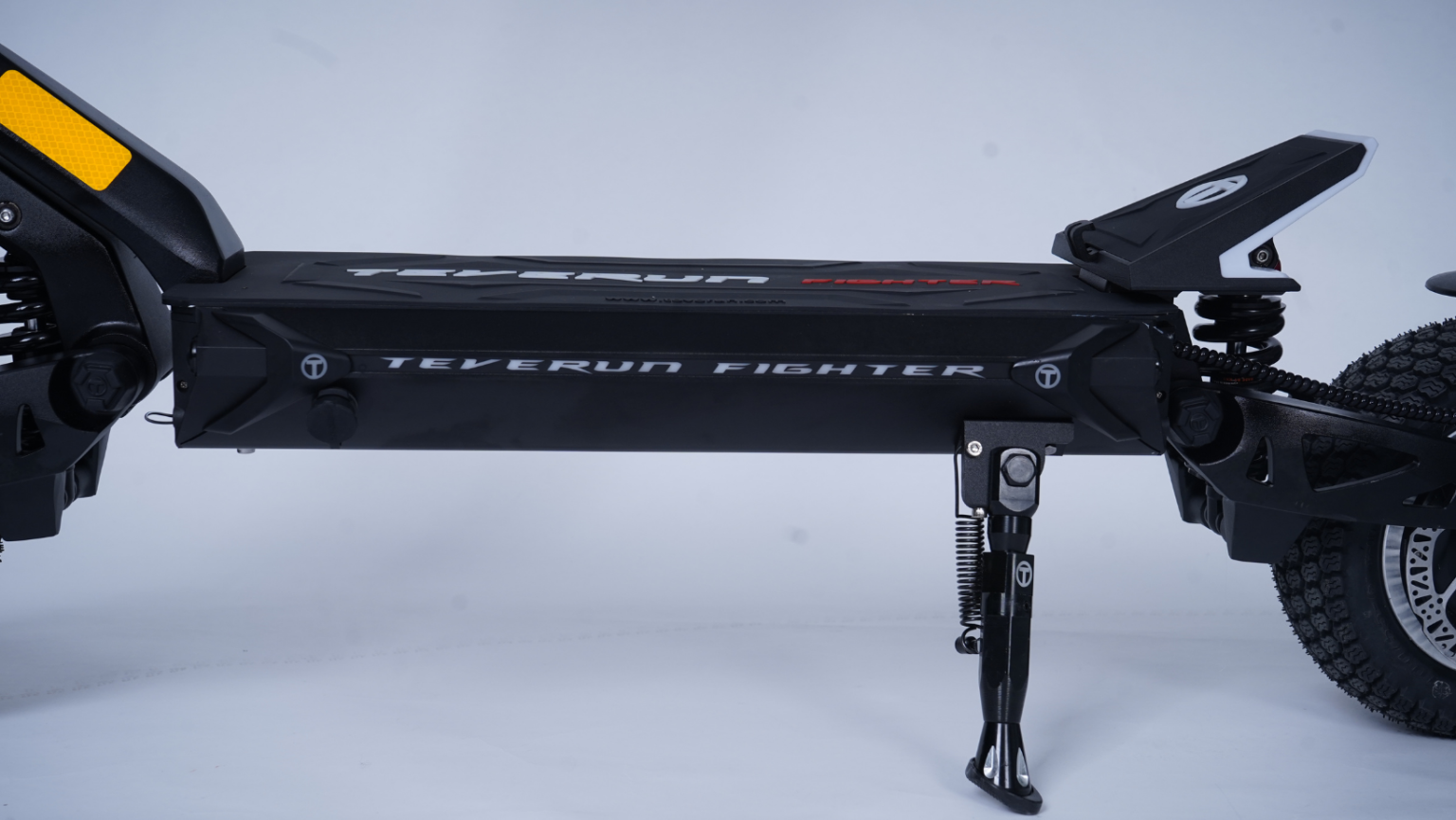 Din cauza roților sale mai mici, Teverun Fighter Ten+ poate arăta inițial ca o trotinetă care este practic capabilă să circule pe unele drumuri de pământ, dar nimic mai mult. Cu toate acestea, odată ce descoperi puterea celor două motoare fără perii care oferă o ieșire combinată de 4000 W, vei uita curând o astfel de prejudecată. După apăsarea manetei de accelerație, fără cele mai mici probleme, Teverun Fighter Ten+ reușește să facă față nu doar terenului accidentat, ci și urcărilor lungi pe dealuri abrupte. Adevărata capacitate a acestui model de la Minimotors pe o suprafață plană este evidențiată de vitezometrul care poate indica o viteză maximă de 75 km/h. Așa cum sugerează și numele, modelul Fighter Ten+ poate „lupta” pe teren ușor în afara orașului, combinând performanța sa pură cu livrarea sa puternică către motoare, datorită unei unități de control duble de 30 A. Însă, o astfel de putere și performanță nu ți-ar fi de folos dacă le-ai putea folosi doar pe câțiva metri. De aceea este echipată cu o baterie Li-Ion de 60 V de la LG/Samsung cu o capacitate de 35 Ah instalată în platformă. În condiții normale, capacitatea bateriei oferă energie de durată pentru călătorii lungi de 120 km. Odată golită, o puteți reîncărca printr-un port de încărcare de pe partea laterală a punții folosind încărcătorul de 2 A furnizat.