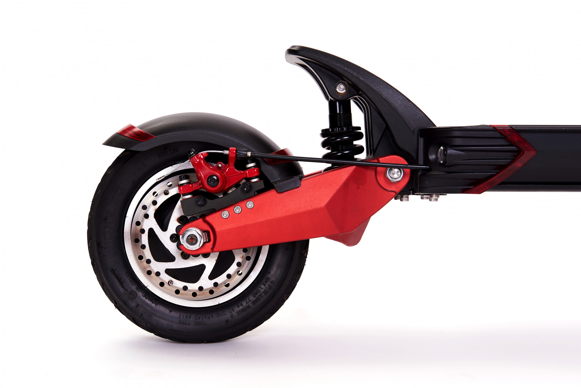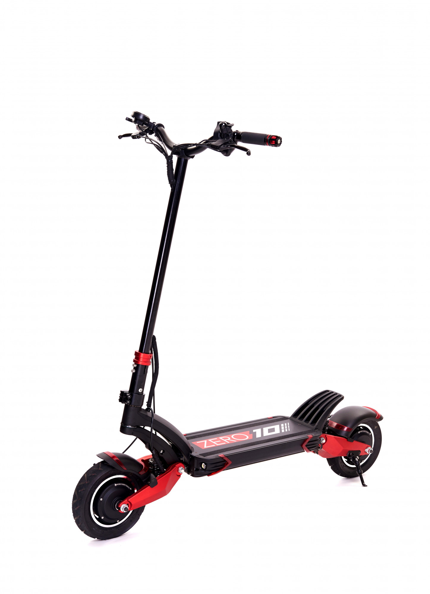 Combinația negru-roșu este o semnătură unică a tuturor modelelor ZERO și arată fantastic pe modelul 10X. Fiind una dintre puținele trotinete existente, 10X are propriul limbaj de design, ceea ce o face să iasă în evidență printre toate celelalte modele din această categorie de performanță, care arată similar între ele, ca o frunză de stejar cu alta. Brațele oscilante cu finisaj roșu dezvăluie amortizorul hidraulic echipat cu arc și fac cunoscut faptul că nu este o trotinetă obișnuită, ci mai degrabă o trotinetă versatilă de tip enduro care nu se teme de nimic. Frânele cu disc se potrivesc perfect cu roțile închise care ascund motorul, evidențiind caracterul sportiv al acestui model. Aceasta este, fără îndoială, una dintre cele mai frumoase trotinete de pe piață, care se bazează pe un design bazat pe funcționalitate, gândit pâna la ultimul detaliu..