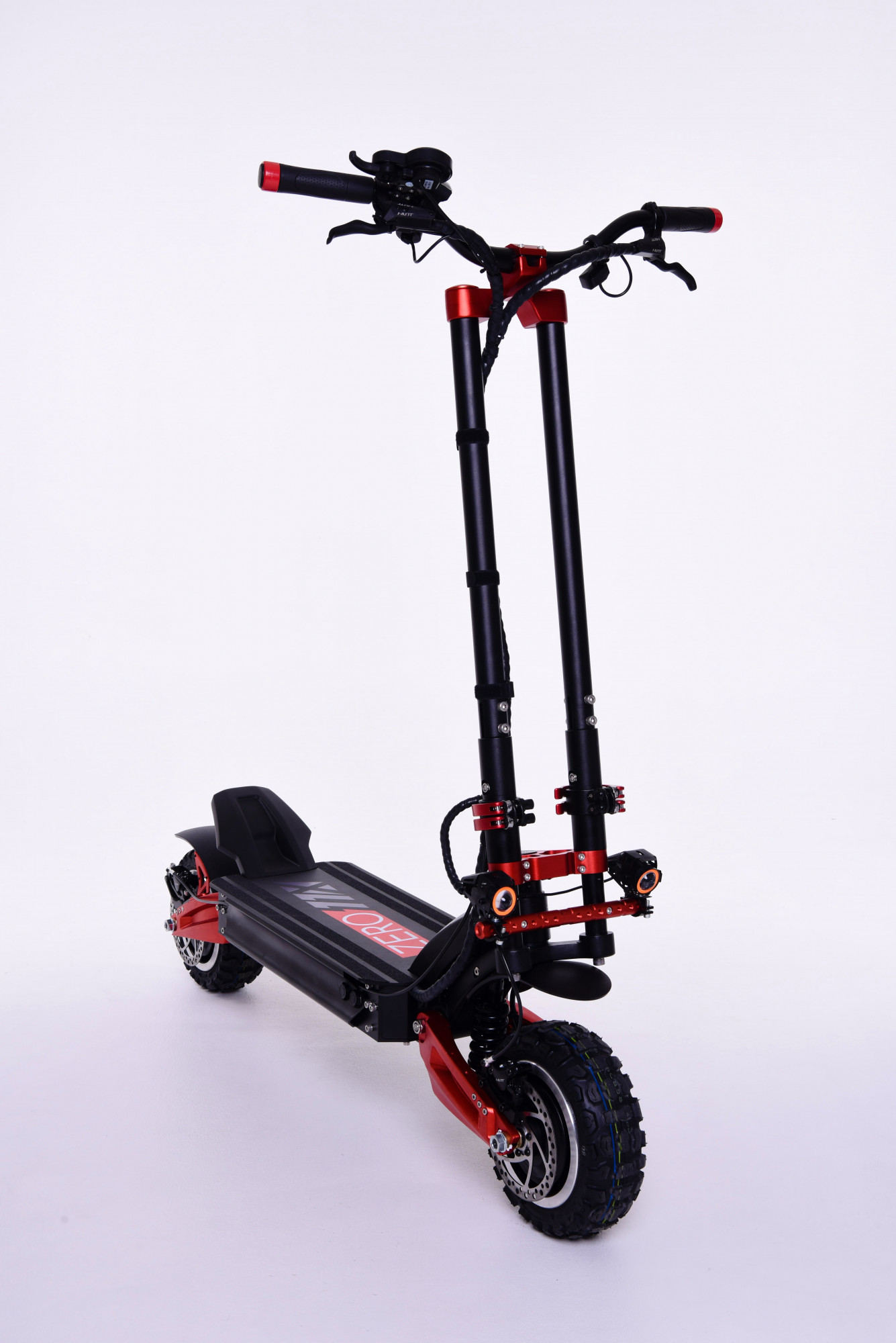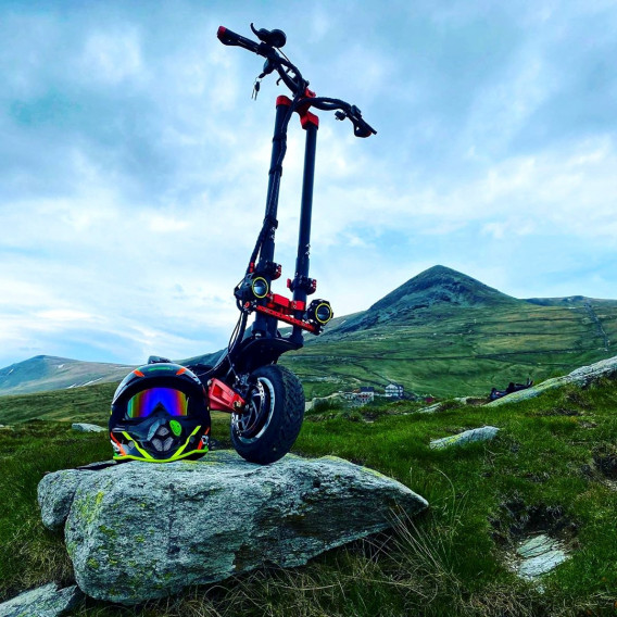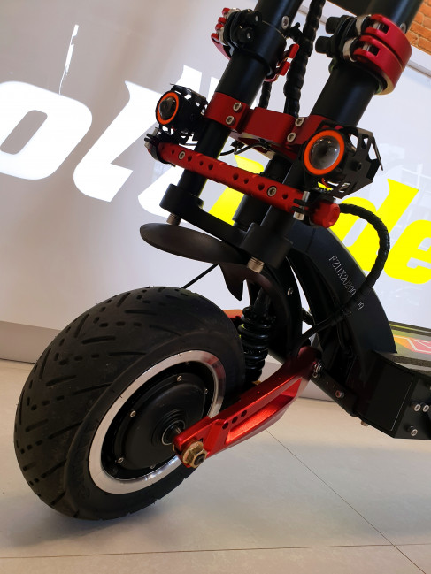 Să începem prin a spune că această fiară cântărește 54 kg. Acest lucru nu este pe placul unei persoane care trebuie să o ridice și să o ducă la etajul șase sau doar să urce câteva scări până la lift. Cu lungimea pliată de 142 cm, lățimea care depășește 70 cm și înălțimea de 60 cm, această trotinetă nu este destinată cu siguranță să fie transportată într-un portbagaj auto sau în transportul public. Chiar dacă o poți pune în portbagajul mașinii tale, trebuie să știi că nu va mai rămâne spațiu pentru a împacheta alte lucruri. Prin urmare, acest model ar trebui mai degrabă perceput ca o mică motocicletă pliabilă decât o trotinetă. Cu toate acestea, când vine vorba de utilizare, caracteristicile și specificațiile sale depășesc cu mult impracticabilitatea. Autonomia de 150 km, viteza maximă de aproape 100 km/h, tracțiunea 2x2 și puterea totală de 6400 W vă vor deschide un tărâm cu totul nou a ceea ce este posibil cu o trotinetă electrică . Poate face față tuturor urcușurilor, chiar și pe teren dificil. Călătoriile dumneavoastră în afara orașului vor fi într-un stil complet diferit. Nu veți deranja pe nimeni cu un motor cu ardere zgomotos, deoarece motoarele electrice puternice produc doar un zumzet liniștit, fără emisii sau stropi de ulei.